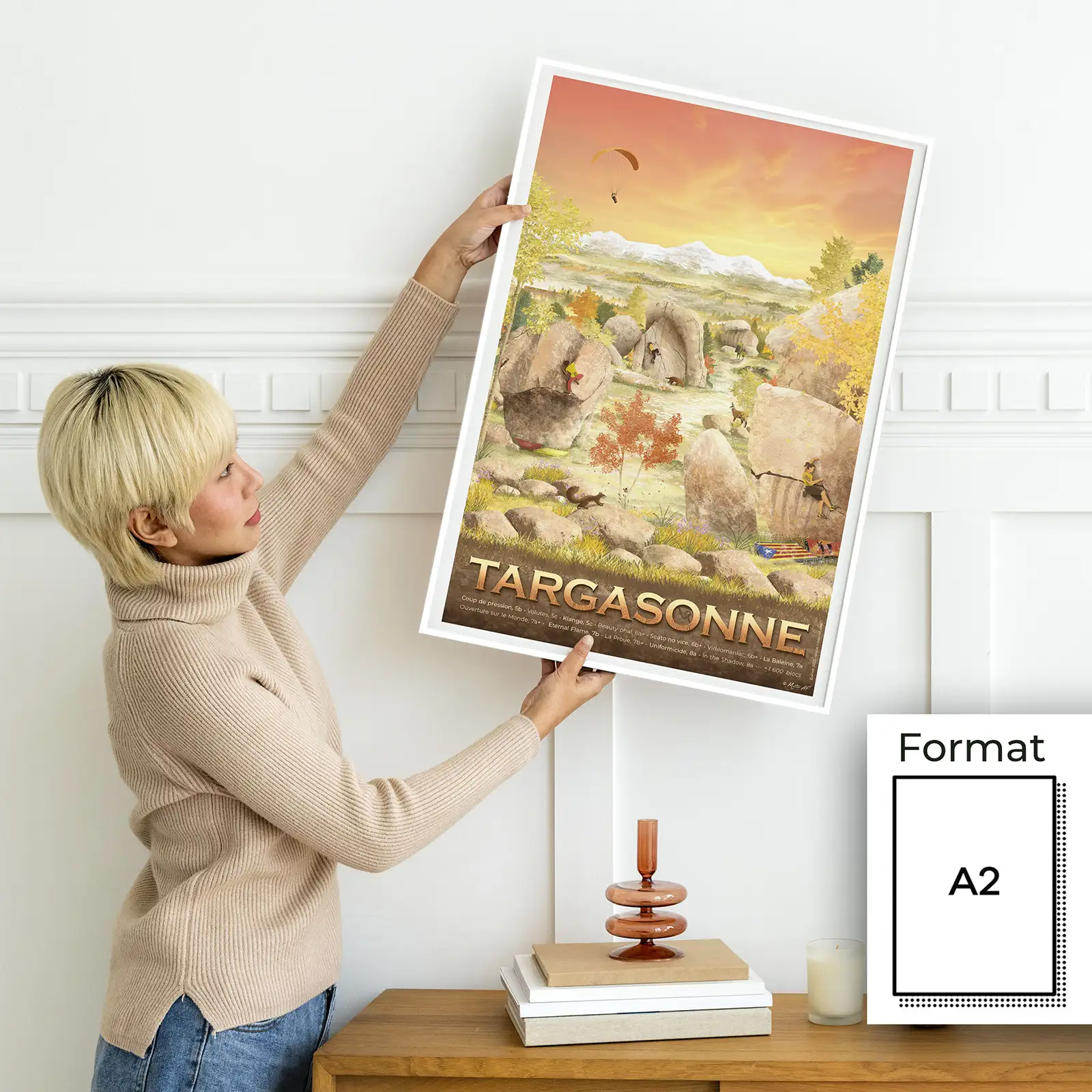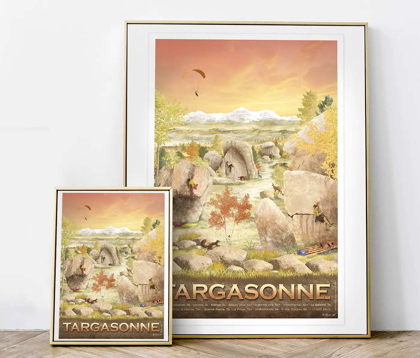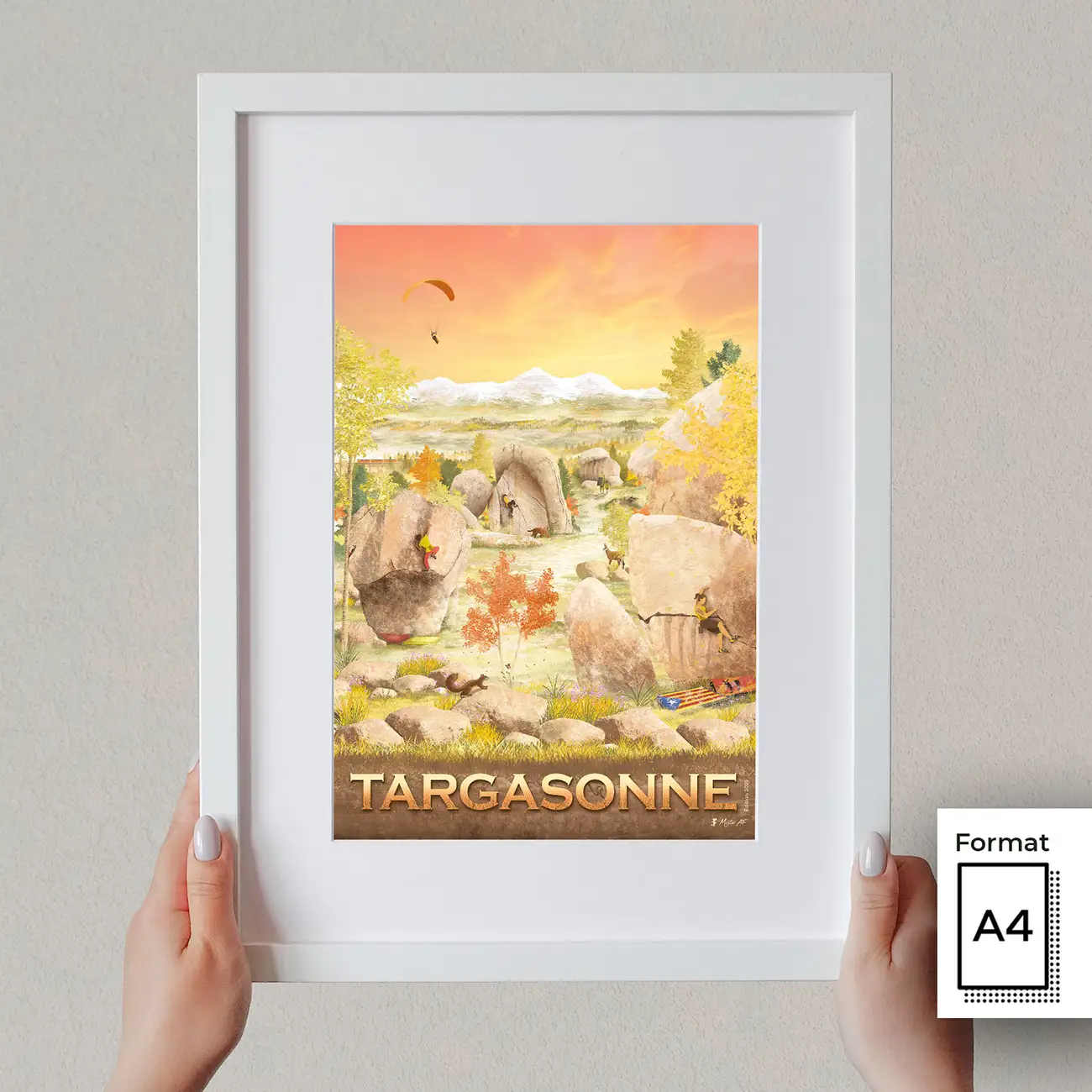 Votre souvenir d’escalade à Targasonne en décoration sur votre mur, à offrir à votre binôme de cordée ! Cette affiche d’art du site de blocs est un dessin réalisé par Mister AF.
