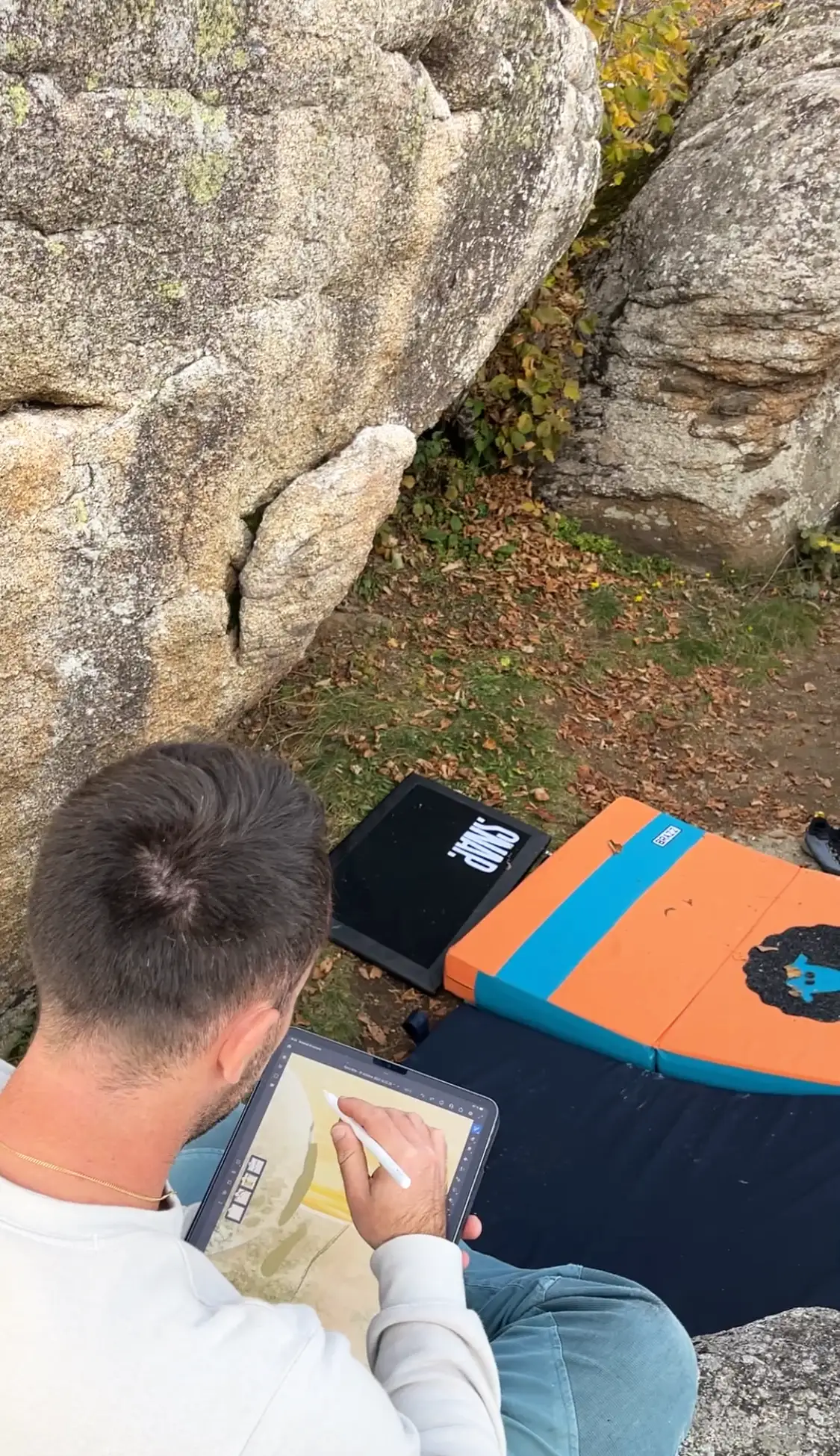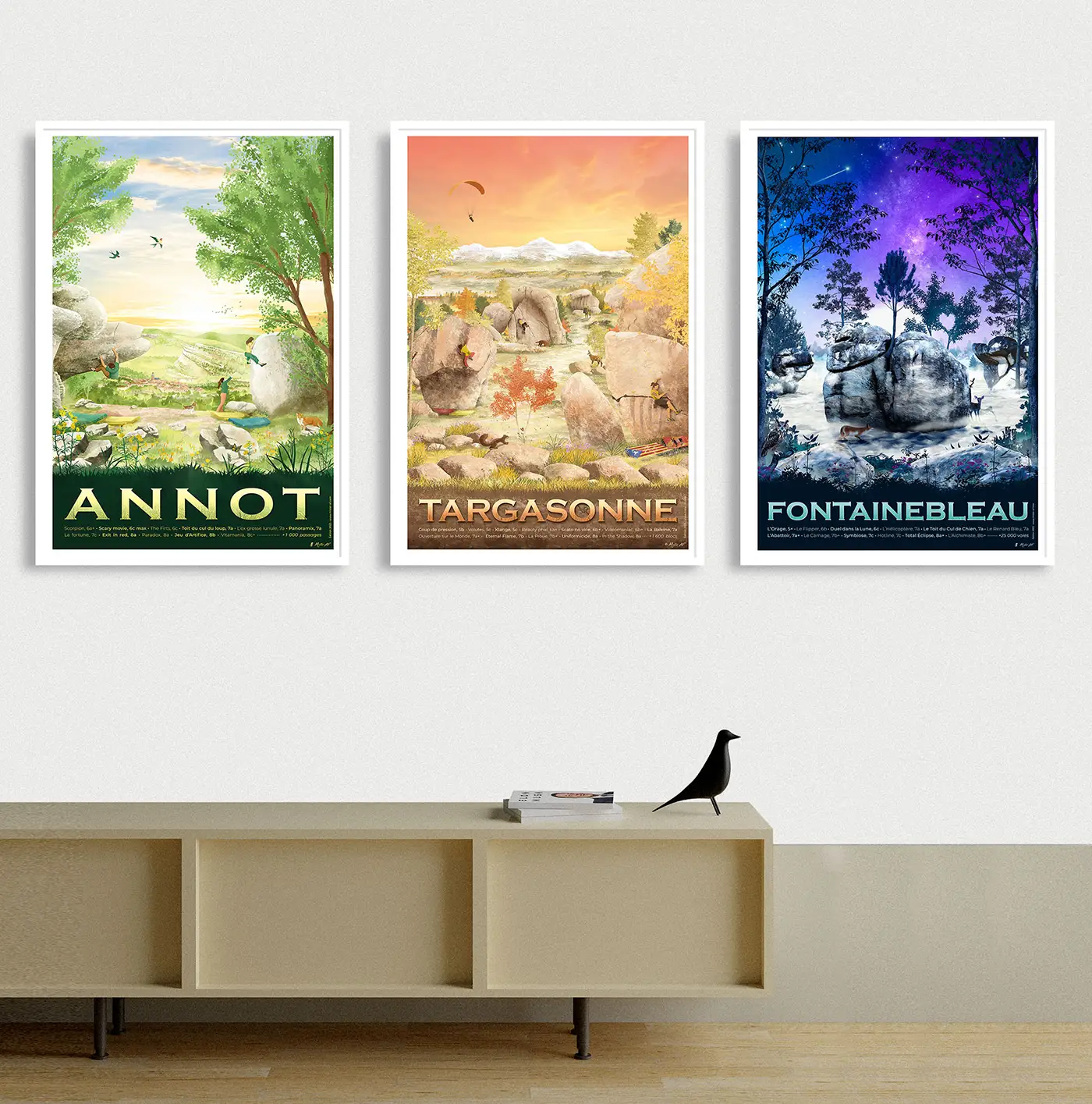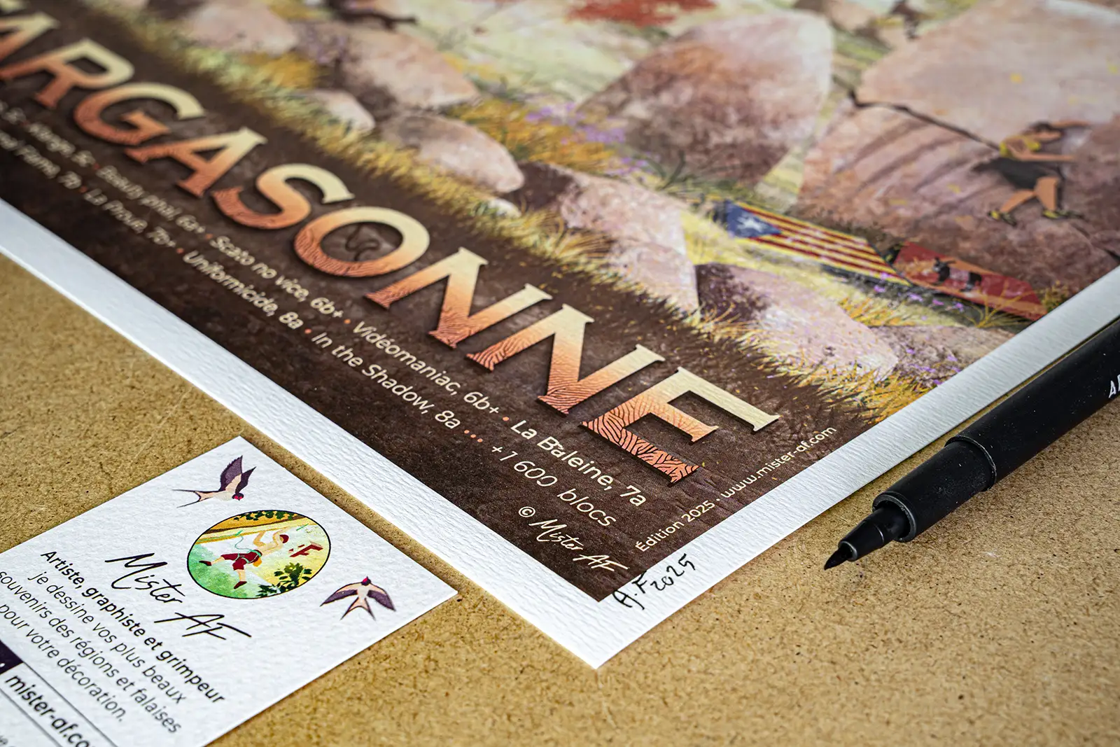 Votre souvenir d’escalade à Targasonne en décoration sur votre mur, à offrir à votre binôme de cordée ! Cette affiche d’art du site de blocs est un dessin réalisé par Mister AF.